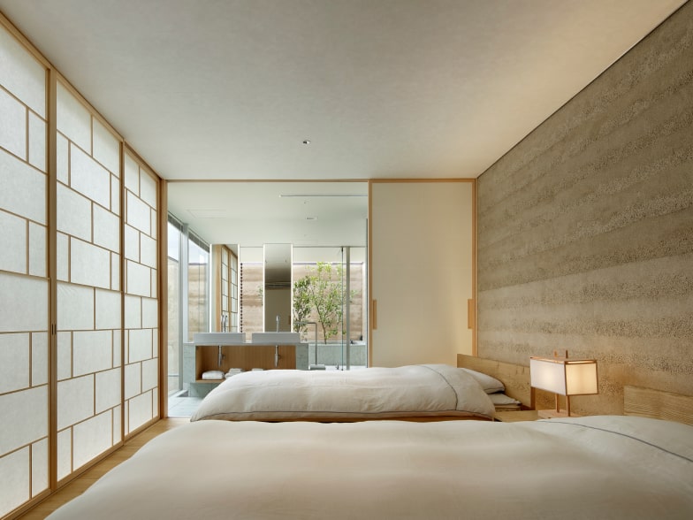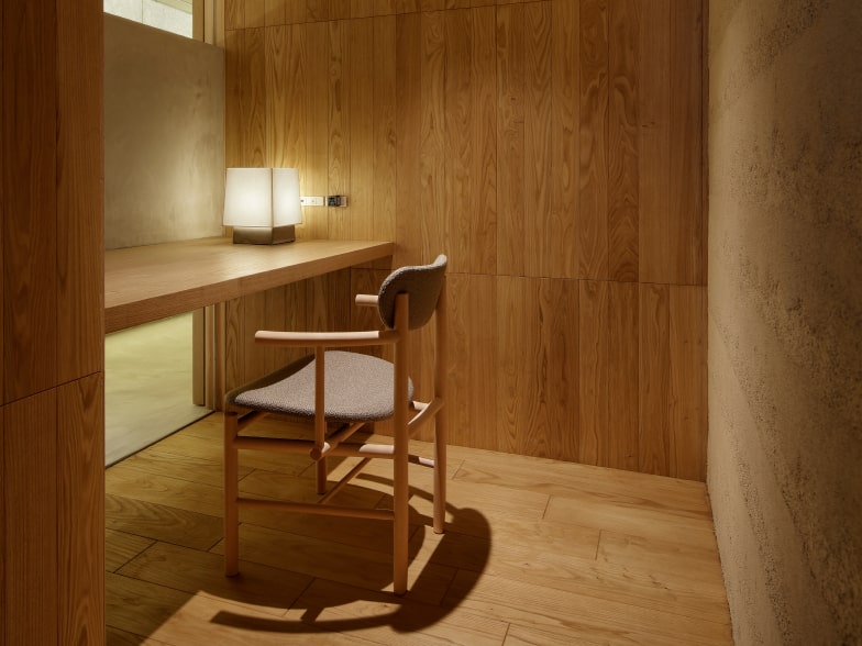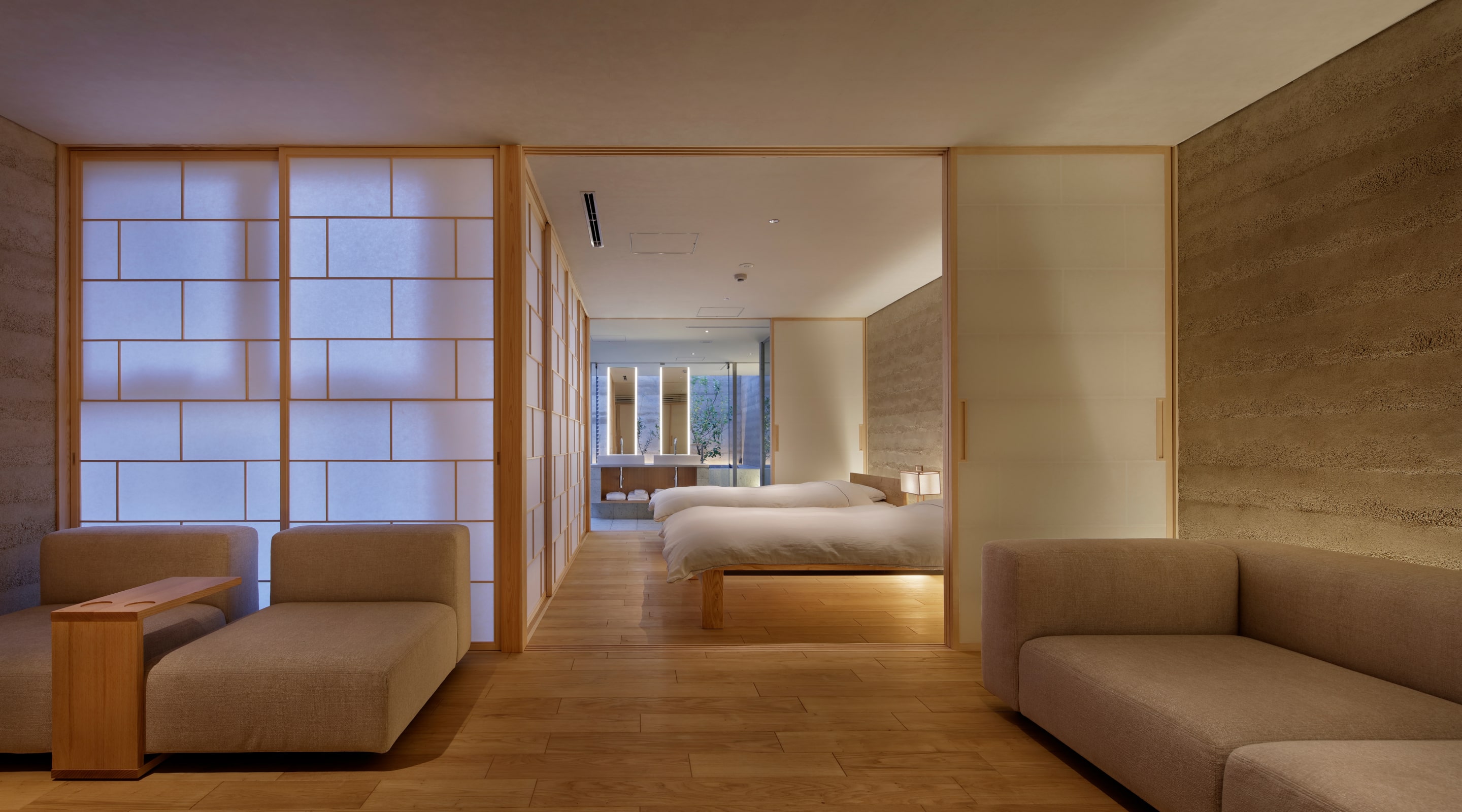 1日1部屋限定で、最上階に位置する床面積約100平米と広いお部屋を独占することが出来ます。広いリビングとあわせて、“おこもりルーム”としての書斎を備えるほか、ほぼすべての空間に床暖房を設置し、快適な時間をお過ごしいただけます。